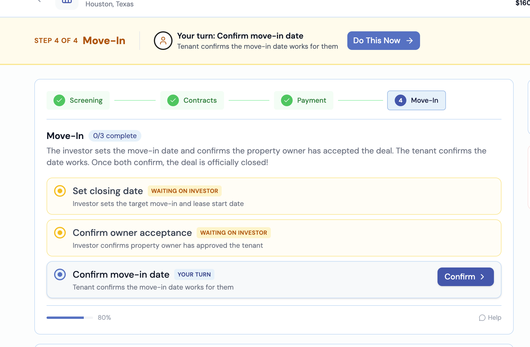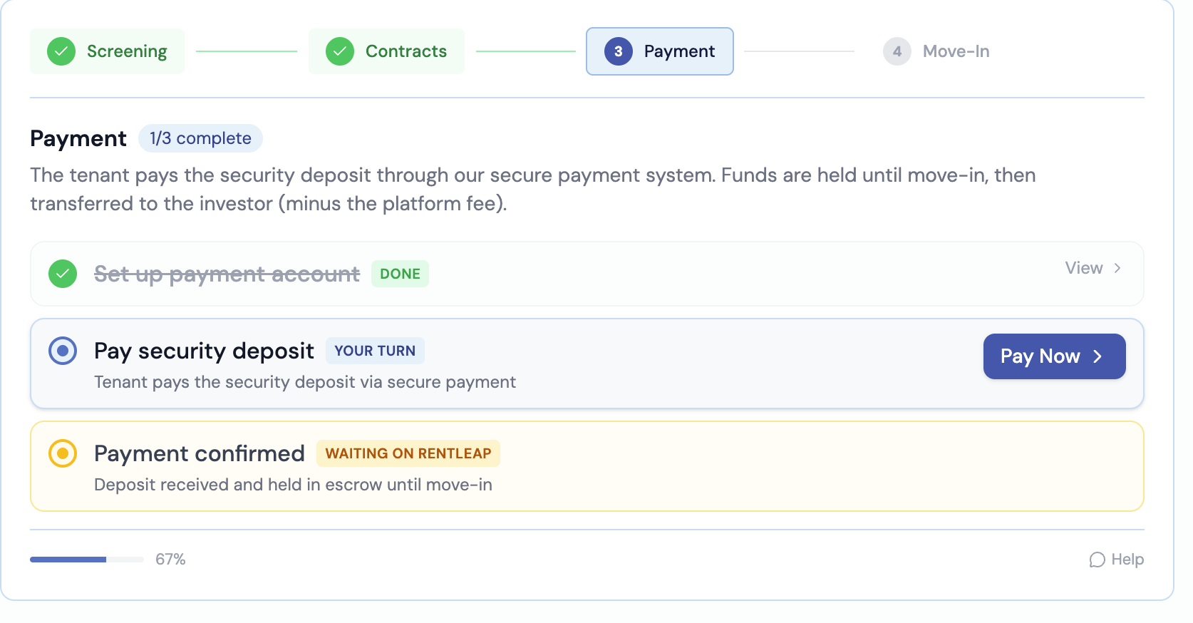 1/3 completeThe tenant pays the security deposit through our secure payment system. Funds are held until move-in, then transferred to the investor (minus the platform fee).